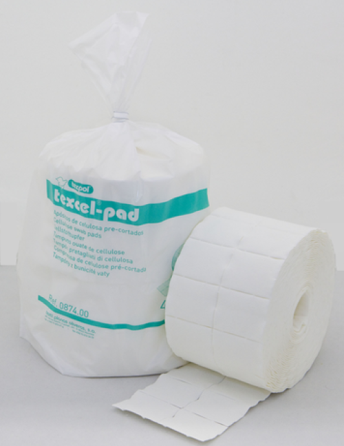 Compressas de celulose pré-cortadas com 4 cm x 5 cm. A compressa é composta por 12 camadas de celulose com grande capacidade de absorção.